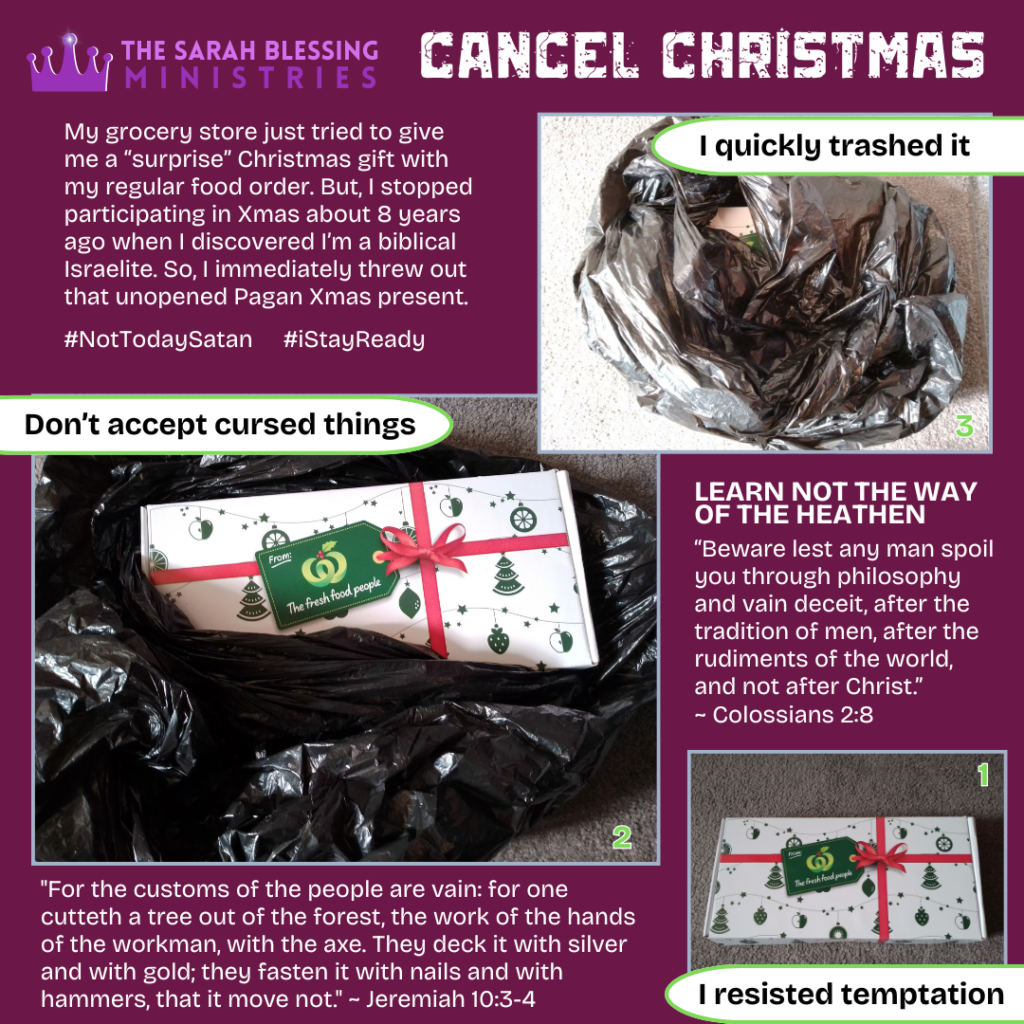 So…. here’s what just happened. My local grocery store just tried to give me a “surprise” Christmas gift with my regular food order. But, I had already stopped participating in Xmas about 8 years ago when I discovered I’m a biblical Israelite. And God’s people never celebrated Christmas in the bible (only the heathen did initially).